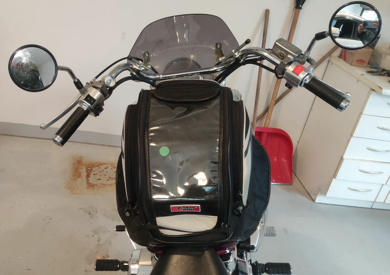 Torba na zbiornik paliwa, ze śladami używania. Posiada duży otwór z przezroczystą folią na dokumenty, trzy duże kieszenie z trzech stron, dodatkowy pokrowiec przeciwdeszczowy. Torba jest oddzielona od podstawy za pomocą suwaka z magnesami, które mocują ją do metalowych zbiorników. Po oddzieleniu od podstawy zamienia się w praktyczny plecak, którego objętość można zwiększyć poprzez rozpięcie kolejnego suwaka.Tadeusz